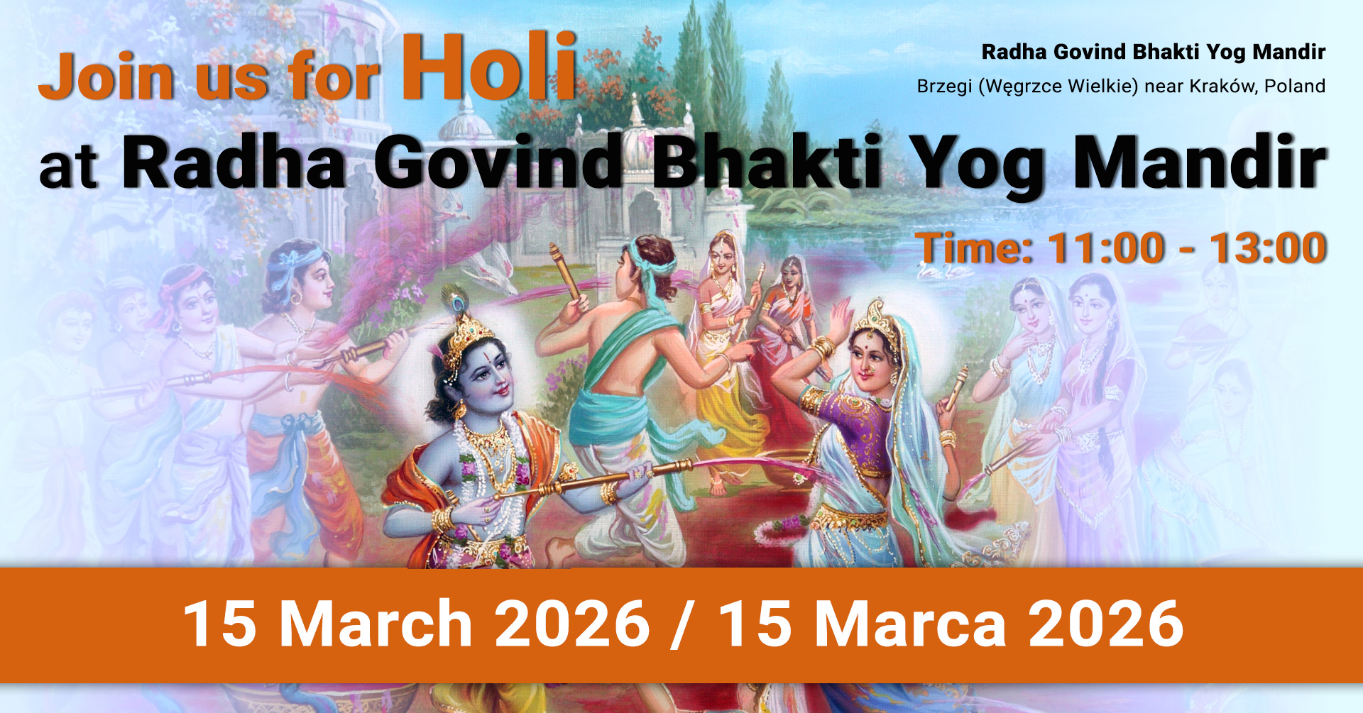 You are cordially invited to a special Holi Satsang at Radha Govind Bhakti Yog Mandir in Brzegi (Wegrzce Wielkie) near Krakow.